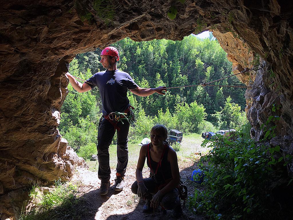 Piątek, sobota i niedziela zostały poświęcone dalszym ćwiczeniom wspinaczki tradowej z rozszerzeniem o wspinanie wyciągowe. Emek wyznaczał nam wzory na skale, a my próbowałyśmy je odtworzyć tworząc w odpowiednich miejscach stanowiska i wykorzystując nabyte dotychczas umiejętności związane z budową stanowisk (również z natury), pokonywaniem trawersów i zjazdami. W przerwach narzuconych przez deszcz chowaliśmy się w jamie i ćwiczyliśmy techniki autoratownictwa. Nauczyłyśmy się m.in. flaschenzuga szwajcarskiego (co dobrze brzmi i każdy chciałby to umieć) oraz przepinania liny przez węzeł. Teraz już wiemy, że gdyby partner Joe z filmu „Czekając na Joe” (z ang. Touching the Void) miał szkolenie u Emka, to nie musiałby odcinać liny na której zawisł ranny Joe. My miałyśmy szkolenie, więc jest szansa, że o nas podobny film nie powstanie. A na pewno postaramy się, by nie powstał.