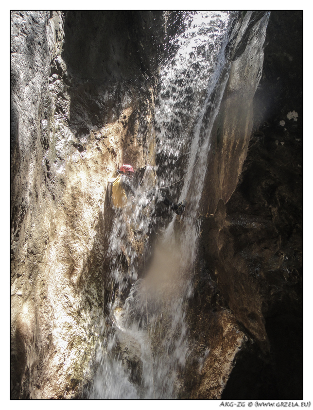 W czwartek za cel obieramy kanion Nowarzza, który wpada do Lumiei. Pierwszy jest bardziej "linowy", drugi bardziej "wodny". Oczywiście postanawiamy zrobić oba. Do początku Nowarzza prowadzi wygodna ścieżka do obsługi położonej powyżej tamy. Kończy się ona przed zamkniętym tunelem skąd 60 m, nieco kruchym zjazdem, docieramy do osi kanionu. Kruchość zjazdu na własnym nosie odczuł Zbychu, przy ściąganiu liny. O ile w środę "prześladowały" nas śmieci "techniczne" o tyle w czwartek "organiczne" w postaci potopionych gryzoni i jednej kozy. To już drugi kanion, w którym pomimo ogromu wody pić się chce niesamowicie. Szkoda, bo kanion dosyć ładnie położony a mnogość bocznych dopływów w Lumiei, zwłaszcza przy ładnej pogodzie, podnosi jego atrakcyjność.