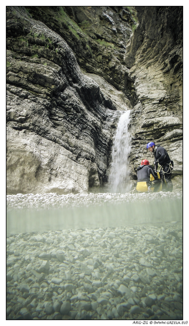 W niedzielę "na rozruch" wybraliśmy króciutki kanion Brussine. Mgliście opisane dojście trochę nas niepokoiło, ale ostatecznie bez problemów i jak "po sznurku" trafiliśmy. Sam kanion, bez większych fajerwerków, ale za to i bez niezbyt ulubionego przez nasz "marche aquatic". Efektowna końcowa kaskada, z widokiem na Chiusaforte i dolinę Fella rekompensowała "trudy" podejścia. Z drugiego brzegu rzeki Alina mogła doskonale "podziwiać" nasze poczynania. Końcowym akcentem całej zabawy było przeprawienie się na drugą stronę rzeki Fella, gdzie czekał już na nas samochodzik. Resztę dnia spędziliśmy na zwiedzaniu okolicy.