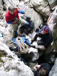 Żeby stworzyć pozory górskiej aktywności, wybraliśmy się po wodę. Podejście pod grań i powrót były fraszką w porównaniu z procesem nabierania wody z wytapiającego się płata śnieżnego. Na dodatek nad nami wspinali się zawodowi mordercy. Do perfekcji opanowaliśmy uchylanie się przed lecącymi kamieniami, które do ostatniej sekundy zmieniały tor, rozsypując się po drodze na mniejsze pociski. Następnego dnia nie wypadało już nie pójść do jaskini. Przeszliśmy prawy meander, docierając do Sali z brekcją, która najwyraźniej okresowo zalana jest wodą, o czym świadczyć może małe jeziorko przypominające ponor i dno pokryte drobnym żwirem. Za salą kolejny meander zapraszał do pokonania.