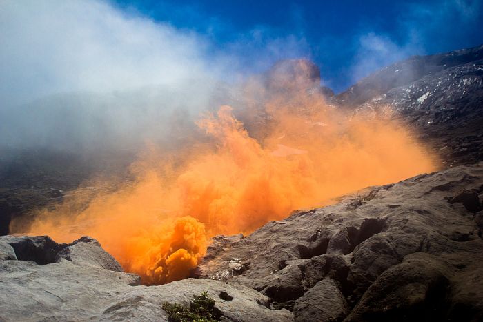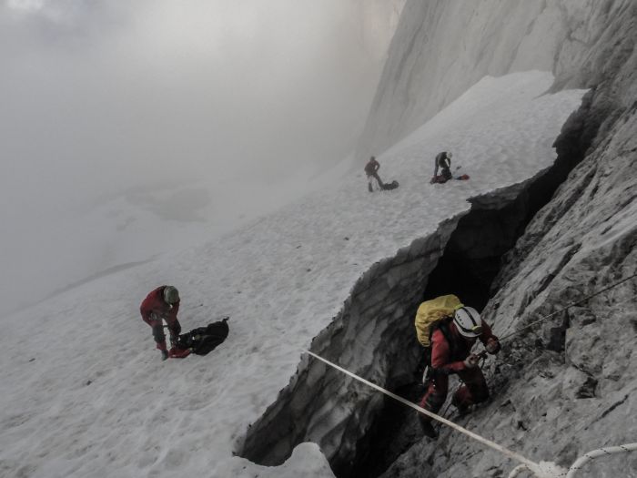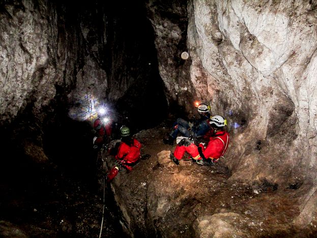 Wreszcie, po uprzednim rekonesansie, pierwsza akcja jaskiniowa w PE001 - jaskini wewnątrz góry Santa Maria (2596 m n.p.m.). Duży otwór zasypany jest śniegiem, toteż atak następuje małym otworem, do którego swobodnie można dojść przez wytopioną przy skalnej ścianie szczelinę. Udaje się przetrzeć szlak do miejsca, w którym drogi z obu otworów łączą się w jeden ciąg jaskiniowy.