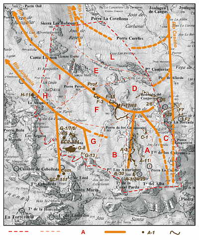 Somewhat shorter, no more than 4 km long, is the system connected with the Río Junjumia. It is relatively little known. Many caves in this area have been not explored to the sump level. The system drains the SW part of the area allotted for exploration. The erosional base lies at altitude 1350-1400 m, while the highest point may reach 2100 m a.s.l., so the maximum vertical range is about 700 m. The system runs from somewhere beneath Jou Sin Tierri towards the NW to the Río Junjumia. In its uppermost course it is supplied, among others, by the already known cave system Sistema Cembavieja (zone of SCP Valencia). Other large caves in this area include, besides those situated in the SCP zone, cave G-13, Red de los Barrastrosas (G-7/G-4/G-5/G-1/G-6), cave SCP 134, Sima de la Porra la Altiquera (H-11), Pozu de la Altiquera. It is difficult to delineate both, the southern and the western boundaries of the system. For this reason it can not be determined where lies the divide between the areas drained by the Río Junjumia and the Río Redemuna.