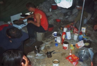 Powrót do zawaliska jest dużo bardziej sprawniejszy (nie trzeba kartować), ale i tak nas to bardzo wymęczyło mięśni rąk nie czułem a do góry jeszcze było z 450m sznurka z ciężkimi worami ponieważ wyciągamy ponton oraz kilka sznurków. Na powierzchni jesteśmy rano i ledwo co docieramy na bazę, tam wymieniamy się z ekipą deporęczującą (Polter, Michał, Bawełniak) i idziemy spać. Po takiej ciężkiej akcji z Tomkiem postanawiamy trochę odpocząć i pochodzić trochę po powierzchni. Celem stał się teren w którym działali kiedyś nasi koledzy z klubu Speleo Gliwic rejon A. Na wycieczce tej zdobywamy szczyt Los Trawiesos, znajdujemy wiele otworów z rejonu A i B a mianowicie otwory najgłębszych jaskiń A-11 i A30 oraz nieznany niepozorny otwór, gdzie się oba pchamy ale bez sprzętu dalej nie damy rady, studnia ok. 15m.Wracamy tu następnego dnia z całym sprzętem i zjeżdżamy 2wie studnie 15m i ok.100m jednak dalej nie mamy lin i wracamy na powierzchnie, gdzie zmieniają nas Bawełniak z Pawłem, którzy eksplorują dalej, jednakże jak się później okazało 100 którą zjeżdżaliśmy była to 80 z A-11 (systemu La Capilla). Ostatnia jaskinia którą eksplorujemy jest A-3, poręczować 1sze studnie 21.08 idzie Polter z Michałem, natomiast ja Monika i Tomek wybraliśmy się na najwyższy szczyt tego rejonu Penia Sante a reszta ekipa poszła na zdjęcia do A-1. Kolejny dzień i kolejne 2wie akcje do A-3, najpierw na poręczowanie idą Stachu z Tomkiem a kilka godzin później za nimi na eksploracje idzie Paweł z Grzelą, do domu wracają już Bawełniak z kuzynem oraz Polter. My następnego dnia też musimy schodzić ponieważ skończył się nam gaz a i jedzenie też się kończyło.