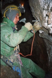 Na dno tej studni zjeżdża już następna ekipa Stachu, Grzela i Tomek, zjeżdżają oni jeszcze jedną podobną studnie i lądują po przejściu krótkiego meandra w wielkiej sali z ogromnym przewiewem powietrza z okna na wysokości ok. 8m. Następna moja akcja była 5.08, idę z Pawłem przewspinać do tego okna i skartować poznane ciągi. Paweł wszedł 1szy do okna i po jakimś czasie krzyczy do mnie: tu ktoś był jest wielka strzałka namalowana, z niedowierzaniem lecę do niego i faktycznie widzę ogromną strzałkę i punkt pomiarowy z którego kartujemy nasze poznane ciągi. Po ciężkim powrocie zdajemy relację reszcie ekipy i Stachu ustala że jest to sala z F-17 tzw. systemu: Sistema del Canalon de los Desvios (F-15, F-17, F-18, B-12). Później idą jeszcze 2wie akcje do D-9 na zaporęczowanie odcinka z poznanej sali do rzeki oraz na zdeporęczowanie całej jaskini. 7.08.03 ja, Paweł oraz Monika explorujemy powierzchniowo w strefie B, jednakże poza kilkoma problemami, które się same zakończyły nie znajdujemy nic ciekawego. 8.08.03 do bazy przyjeżdża (Polter) Łukasz Pol z Niemiec.Po 2wóch dniach odpoczywania w bazie 9.08.03 całą naszą 3ką Paweł, Tomek oraz ja idziemy poręczować F-17 do połączenia z D-9. Jaskinia ta jest niesamowitą dziurą 2wie ogromne studnie 150m robią niesamowite wrażenie, poza tym są tam jeszcze 2wie 80 i takie małe pierdołki. Z dziury wychodzimy w nocy i dojście do bazy okazuje się nieco problematyczne ponieważ byliśmy tam 1szy raz i jeszcze nie mieliśmy obycia z tym terenem ale jakoś udało nam się trafić do naszej wymarzonej bazy.