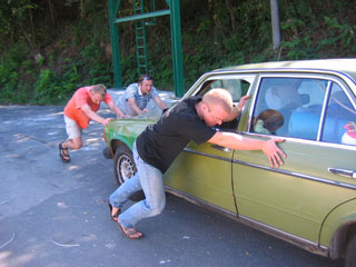 PS. Za każdym razem na stacji benzynowej, gdzie zatrzymujemy się, aby zatankować zamiast jak cywilizowani ludzie wsiąść przekręcić kluczyk i ruszyć to dwóch z nas staje za tyłem samochodu i odpala go "na pych", przy dużej uciesze obserwujących nas dookoła Niemców. Oczywiście czasami, czyli kilkukrotnie Zbychowi zapomniało się wyłączyć hamulec ręczny, więc było trudniej pchać.