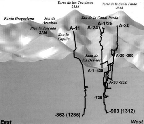 1994 The main goal of the SCW expedition was exploration of Pozu del Picu de los Asturianos (A-30), where they achieved -726 m. Surface prospection was continued in Jou Arenizas (C) and Canalon de Los Desvios. The former did not bring a single cave deeper than 50 m, while in the latter F-17 proved to be the entrance to a cave 477 m deep. After a subsequent connection with a higher entrance (F-18) Sistema del Canalon de Los Desvios (F-17/F-18) became 501 m deep. Also found was the entrance to F-15. 1995 Exploration of Pozu del Picu de los Asturianos (A-30) was continued parallel with the exploration of Sima de los Traviesos o de los Organos (A-1), resulting in their communication and establishing a new interesting cave system - Sistema del Jou de la Canal Parda (A-1/A-30). As usual Jou de Arenizas (C) was searched and as usual several new shallow caves were found (for instance C-7, about -70 m). Activity in Canalon de Los Desvios was also continued. Exploration in F-15 resulted in its connection with the known parts of Sistema del Canalon de Los Desvios (F18/F-17), largely extending the system.