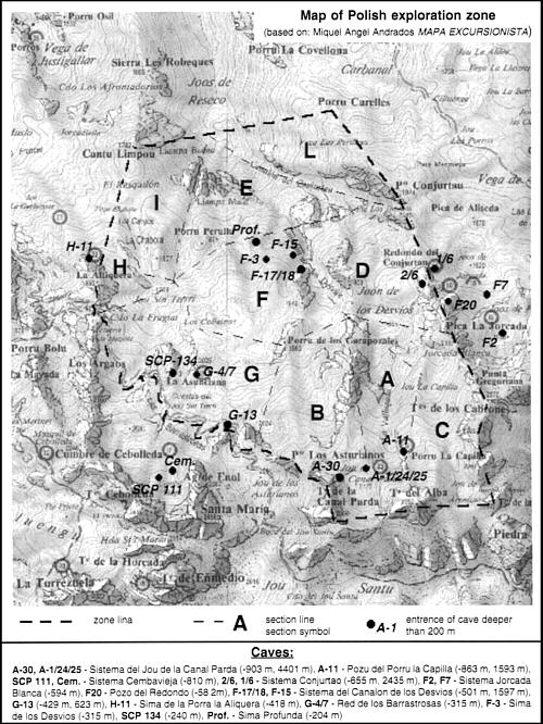 1996 Sistema del Jou de la Canal Parda (A-1 /A-30) was deepened down to 903 m. Prospection was done for higher entrances to this system and to Pozu del Porru la Capilla (A-11). Section NS Section EW Sections of explored caves Sima de los Desvios (F-3) was searched with a view of connecting it with Sistema del Canalon de Los Desvios (F-15/F-17/F-18). The activity of the Polish groups in the western massif (El Cornion) of the Picos de Europa since 1978, though irregular, brought about some results, especially in zone A. There were in all fifteen Polish expeditions organized by the following clubs: Speleoklub Warszawa (1978), Speleoklub Gliwice (1979, 80, 84, 87, 88, 89), Sekcja Taternictwa Jaskiniowego Czestochowa (1986), Katowicki Klub Speleologiczny (1986), Sekcja Grototazow Klubu Wysokogorskiego Wroclaw (1989) and Speleoclub Wroclaw (1991, 93, 94, 95, 96). The history of exploration, presented above, was reconstructed on the basis of so rich a material that it can not be listed here. Many facts in this material were contradictory. Special thanks go to our friends Armando Alonso Bernardo Fernandez and Juan Jose Gonzalez Suarez from Federacion Asturiana de Espeleologia and all those Spaniards thanks to whom the expeditions to the Picos will remain our best memories.