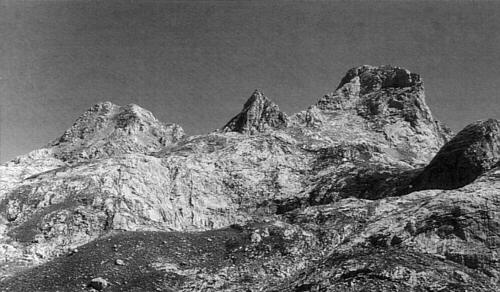 During the same expedition began the exploration of the virtually unknown southeastern part of the area, resulting in more than 40 new caves (including A-30), mostly shallow ones. Only A-11 (Pozu del Porru la Capilla) offers some prospects. Its exploration ended with an accident at the depth of ca. 120 m. During a violent rise in waterflow Piotr Kolodziej died. After the rescue operation, the members of the expedition decided to postpone exploration and come back to Poland. The cave was explored to about -180 m. In the same year members of Speleo Club de la Universidad Politecnica de Valencia (SCP) discovered Sima Parodia (SCP) and attained in it the depth of ca. -38 m. Cavers from OUCC made a connection Peaks surrounding Jou de la Canal Parda, ph. R. Pasiok Peaks surrounding Jou de la Canal Parda, photo by R. Pasiok of Pozu los Perdices (F7) with Pozu Jorcada Blanca (F2), resulting in the Sistema Jorcada Blanca (F2/F7). 1985 The drama of the former expedition dissuaded members of SG from the next expedition to the Picos.