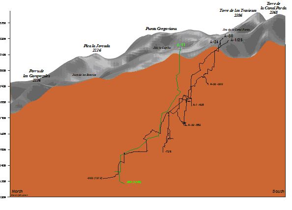 Jaskinia ta jest położona na przełęczy między Torre de la Canal Parda i Picu de los Asturianos na wysokości ok. 2255 m npm. Możliwości eksploracyjne badał zespół Marcin Buchla, Marek Jędrzejczak. Duży ubytek lodu w porównaniu z rokiem 1994 spowodował, że zalegający kiedyś na dnie pierwszej studni P 15 korek śnieżny znacznie zmalał co pozwoliło na wejście do meandra kontynuującego się w kierunku północno-wschodnim na linii słabo zaznaczonego na powierzchni pęknięcia biegnącego w stronę Sima de los Traviesos o de los Organos (A-1). Meander na głębokości ok. -20 m zagruzowany jest luźnymi, łatwo urabialnymi blokami.
